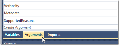 Let’s tackle the FileMask first. To do this we’re going to add a new Argument to our overall workflow. Find the Arguments tab at the bottom of the designer: